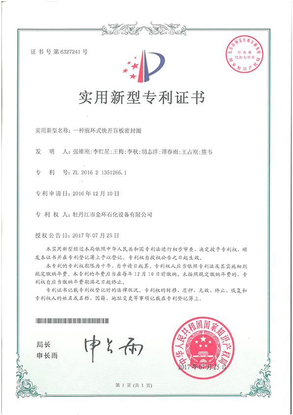 一種漲環(huán)式快開盲板密封圈實用新型專利證書ZL 2016 2 1351266.1