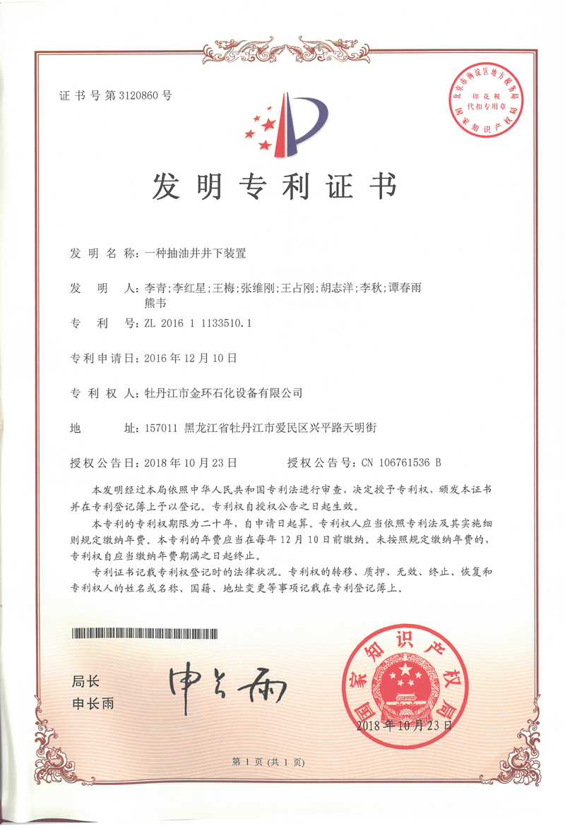一種抽油井井下裝置發(fā)明專利證書ZL 2016 1 1133510.1