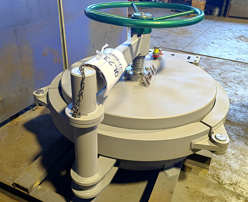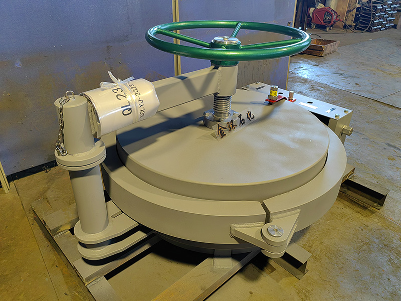 快開(kāi)盲板是用于壓力管道或壓力容器的圓形開(kāi)口上的一種機(jī)械裝置。一般由筒體法蘭、頭蓋、勾圈或卡箍、密封圈、安全聯(lián)鎖機(jī)構(gòu)、開(kāi)閉機(jī)構(gòu)、轉(zhuǎn)臂及短節(jié)(需要時(shí))等部件構(gòu)成。